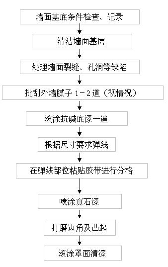 涂層質(zhì)量的優(yōu)劣,除了與涂料本身質(zhì)量的好壞有關(guān),還與施工技術(shù)水平有很大關(guān)系,為了保證真石漆的施工質(zhì)量,必須要有正確的施工工藝和正確的施工方法,并要求施工人員嚴格按工藝要求進行施工。